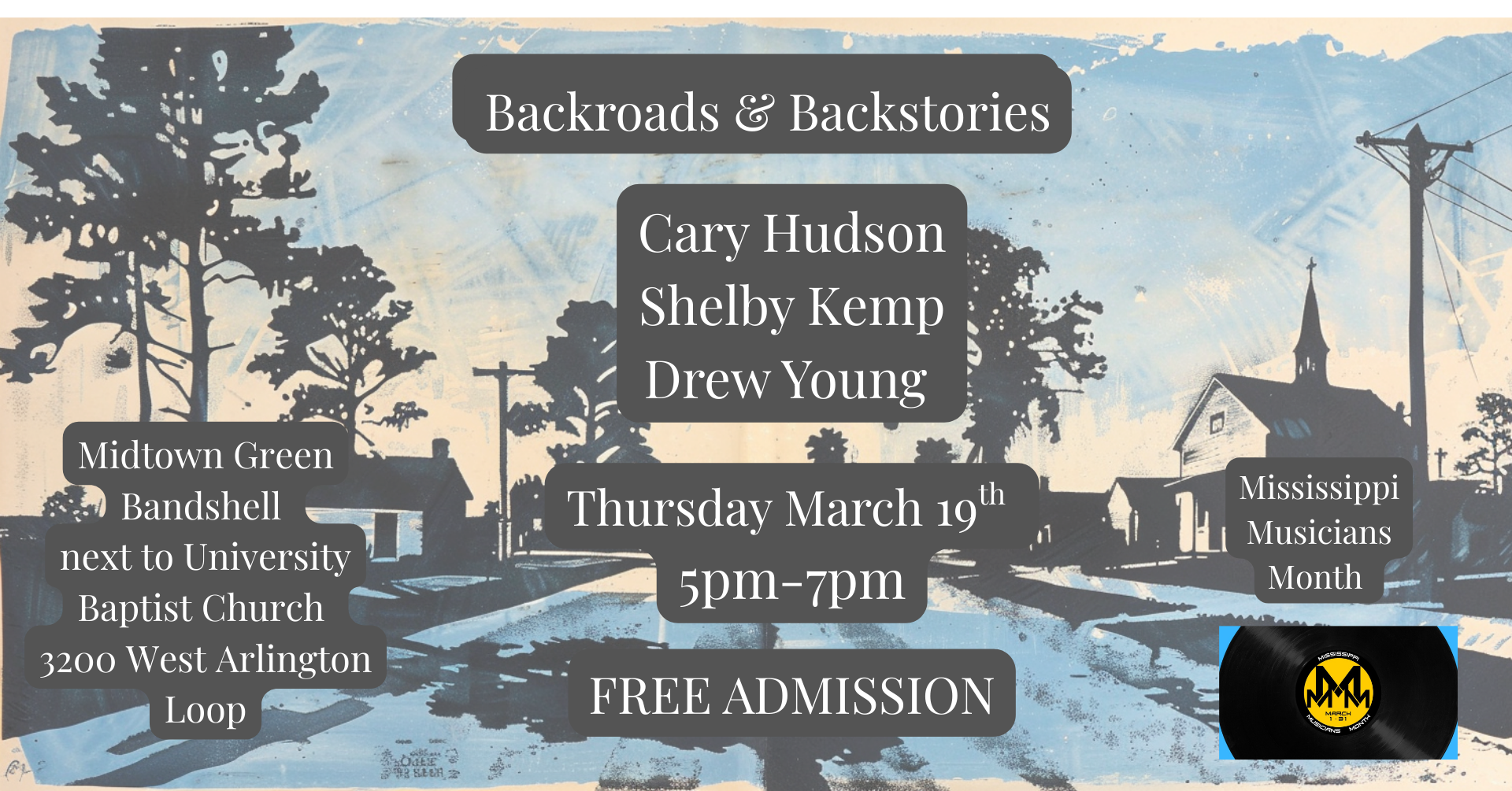 Back Roads & Back Stories will host the first public performance on the brand-new Craig Wiseman Bandshell Stage at Midtown Green Park on Thursday, March 19 at 5 p.m. Part of the Third Annual Mississippi Musicians Month, this free, family-friendly concert will feature Drew Young alongside celebrated Mississippi songwriters Cary Hudson and Shelby Kemp. Bring a lawn chair or blanket and enjoy an evening of live music and storytelling as Hattiesburg celebrates its rich musical heritage under the open sky.