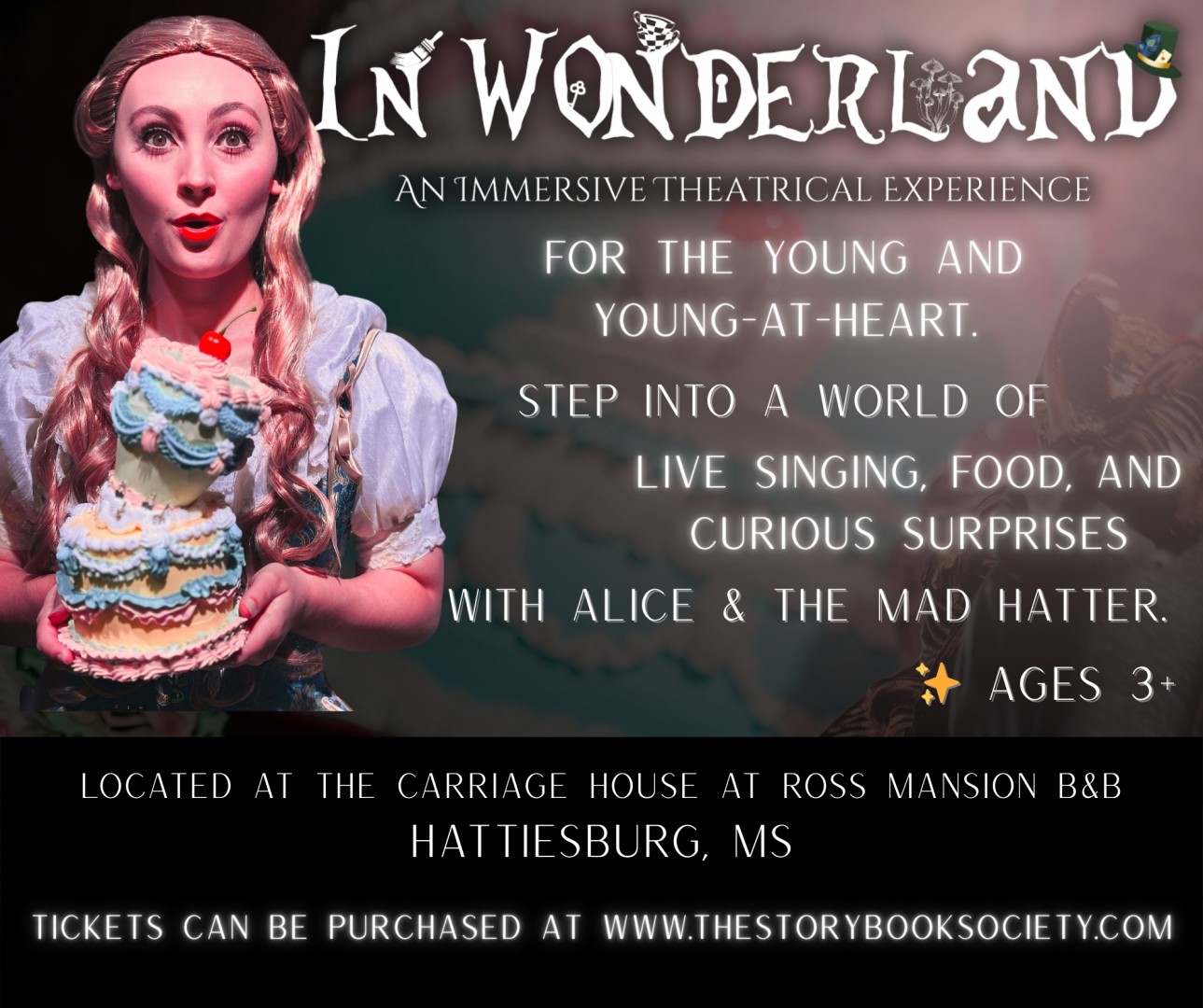 Featuring original music, live singing, playful moments with Alice and the Mad Hatter, delicious food, and a few delightful surprises along the way.
