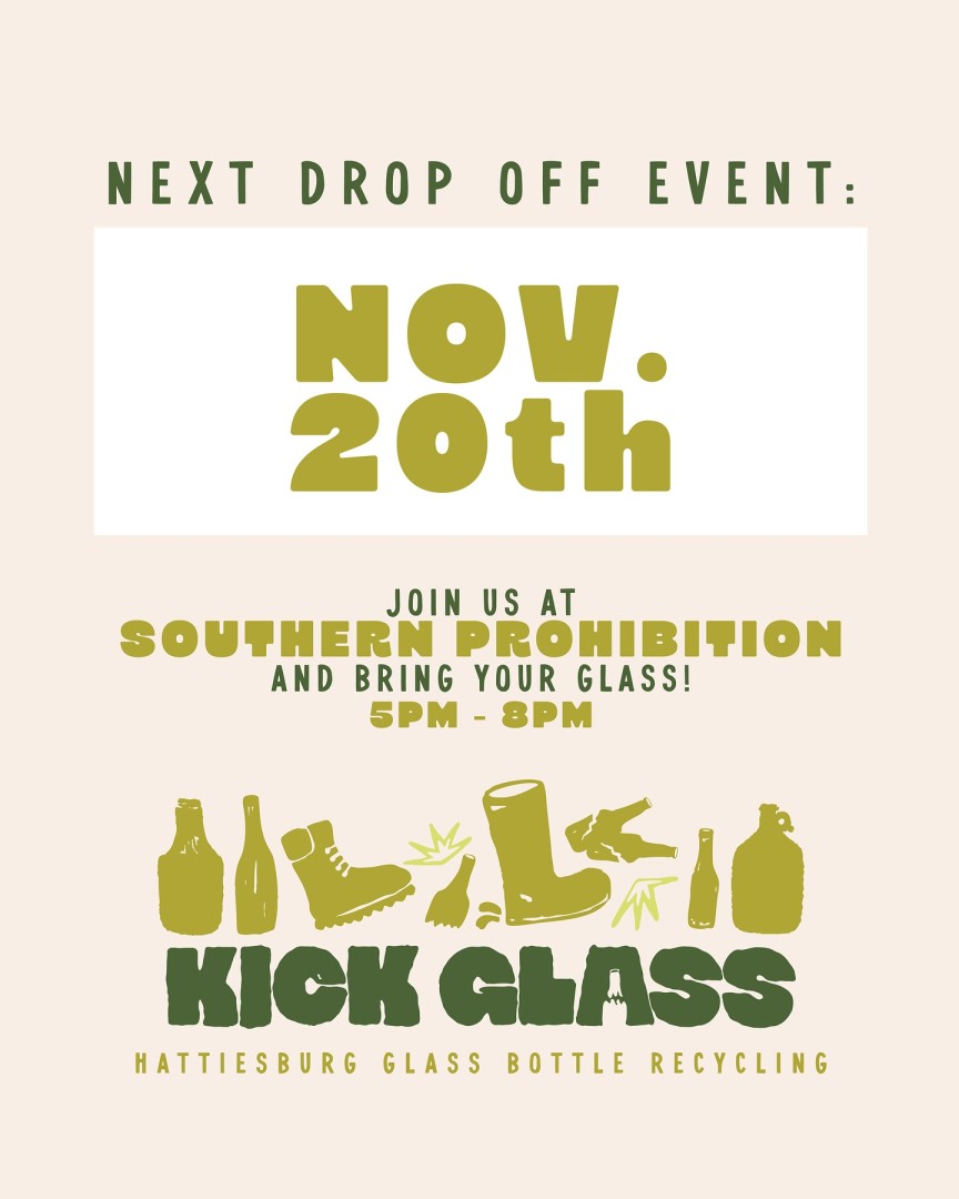Monthly glass bottle drop-off/crush event hosted by Kick Glass Hburg, Hattiesburg's first glass bottle recycling program, an initiative of the Piney Woods Conservation Group. Bring your empty, clean glass bottles to SoPro Brewing and help us Kick Glass for a cleaner, greener Pine Belt!