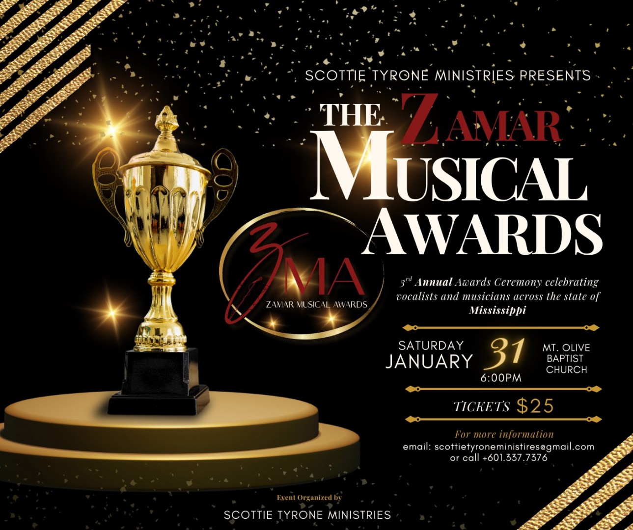 The 3rd Annual Zamar Musical Awards (ZMA) is a night set aside to honor legendary, pioneering vocalists across the state of Mississippi. Enjoy special performances celebrating Mississippi Vocal GREATS!