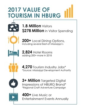 Hattiesburg hosted more than 1.8 million business and leisure travelers in 2016, making it the third most visited city inMississippi. While the State’s overall tourism industry has seen gradual growth, HBURG is swiftly increasing as the city provides more reasons to visit to travelers.